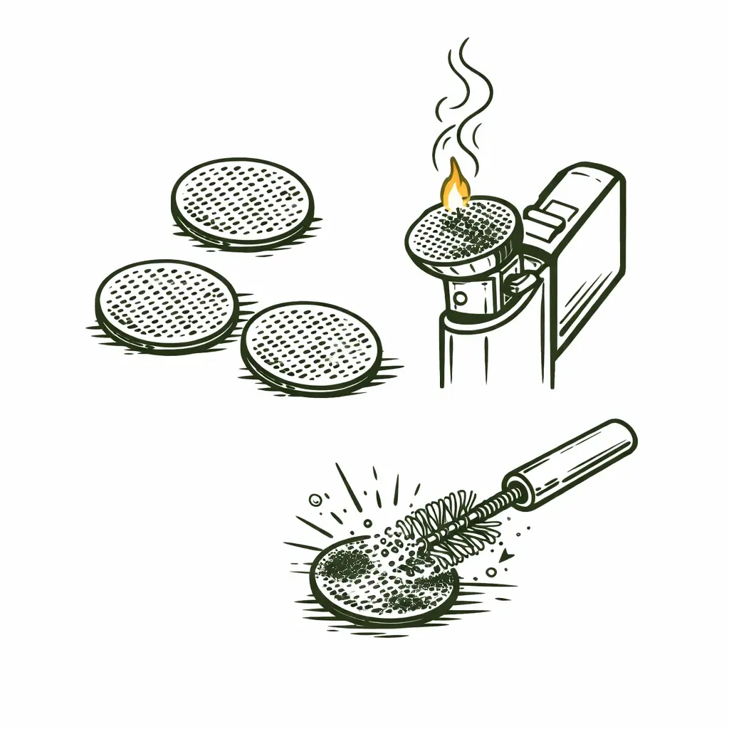 Hängesiebe haben gegenüber von flachen Einlegesieben den nicht ganz unerheblichen Vorteil, daß das Material ein deutliches Stück dicker ist und damit natürlich auch staibler. Das heißt in der Praxis, daß beim Säubern weniger Schäden auftreten können bzw. aber auch, daß man heftigere Geschütze zur Reinigung auffahren kann. Grobe Stahlbürsten bzw. Werkzeugbürsten kann man hier durchaus einsetzen und den Dreck einfach Wegschrubben. Der Haupttrick besteht darin, den Sieb kurz einmal mit einem Feuerzeug anzugühen. Schlaue Menschen verwenden hier eine Zange oder auch eine Nagelschere (solche mit Gummigriffen - wichtig ist ein nicht-wärmeleitendes Material) zum Halten des Siebes . Am Besten, man zündet die Sieb bzw. die öligen Rückstände in der Verschmutzung einfach an und wartet bis die Flamme von selbst ausgeht. Im Anschluss ist der Schmand schön trocken und kann einfach weggeschrubbt werden. Hierfür verwendet man dann eben eine Bürste für Bongsiebe oder auch einen Kratzer.Einlegesiebe aus Stahl oder Messing